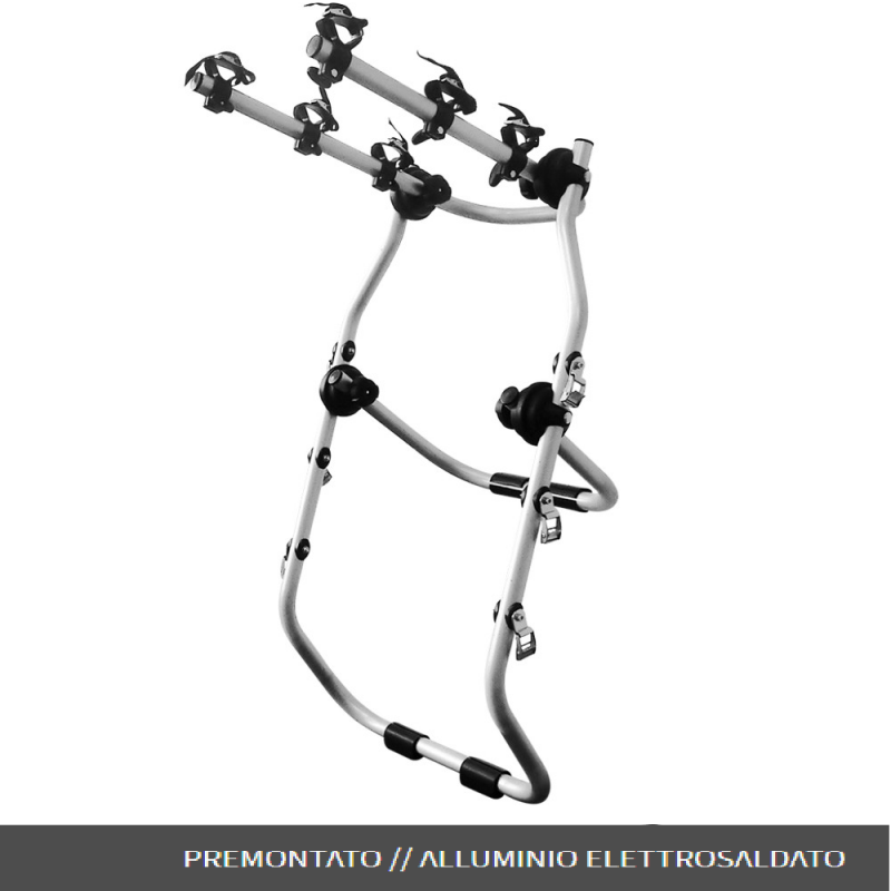 • Portabici posteriore per il trasporto di 2 o 3 biciclette, realizzato per vetture con cofano o portellone standard così come per vetture con spoiler, lunotti di vetro o paraurti in plastica